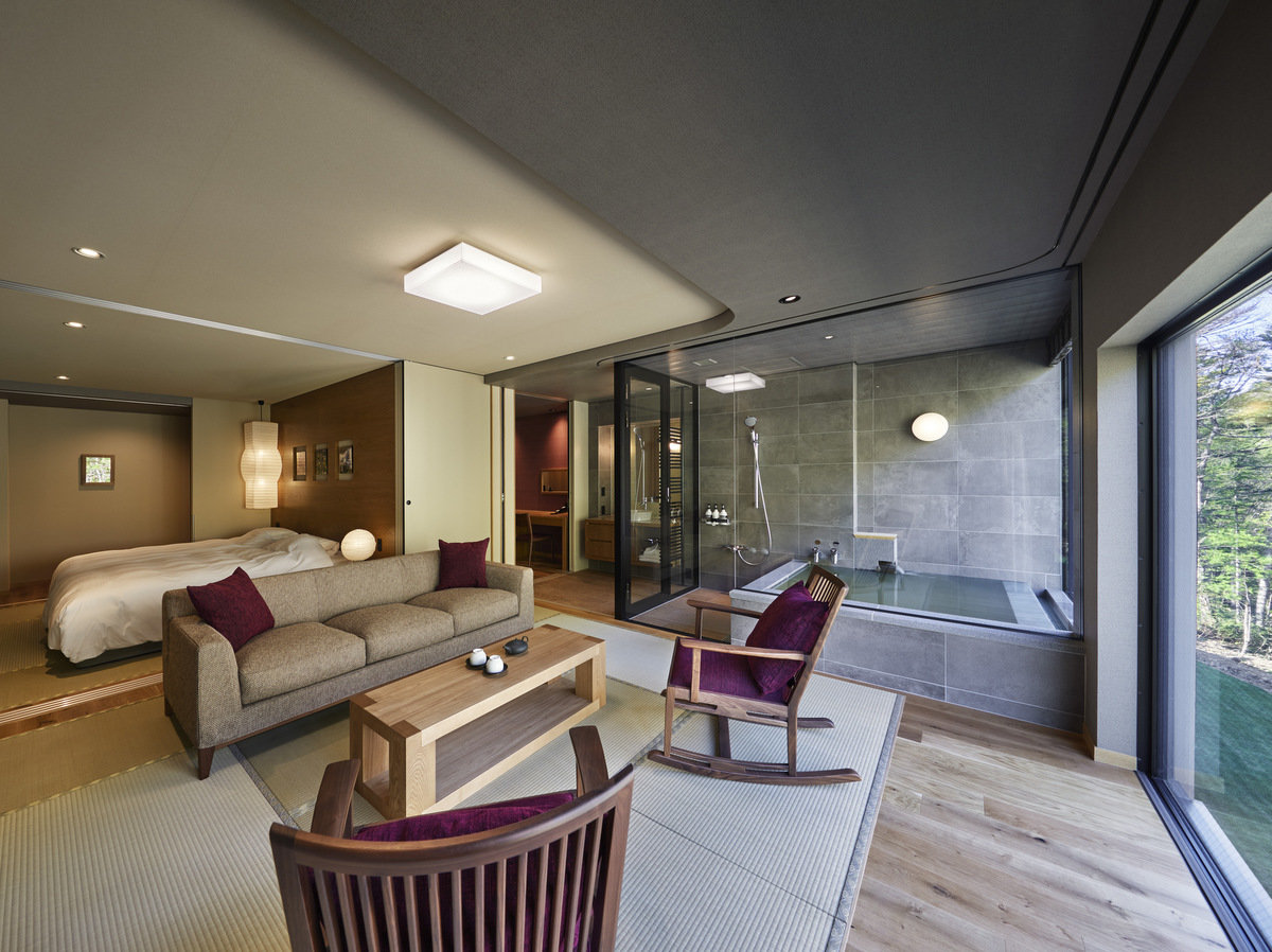 B バルコニー付きスイート(53〜58u/定員2名) 想定:屋外テラスで風にあたりながら、ゆったりと休憩やクールダウンを楽しめる滞在スタイルにぴったり 利点:バルコニーで風を感じながら換気や着替え、体温を整えつつ、自然を眺めてゆったりとくつろげます 注意点:バルコニー出入口のドア幅や段差の有無は、事前に確認しておくと安心です