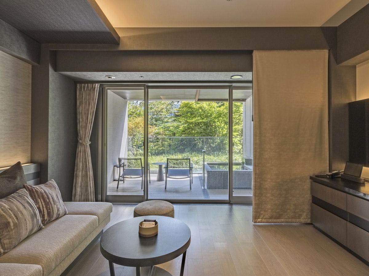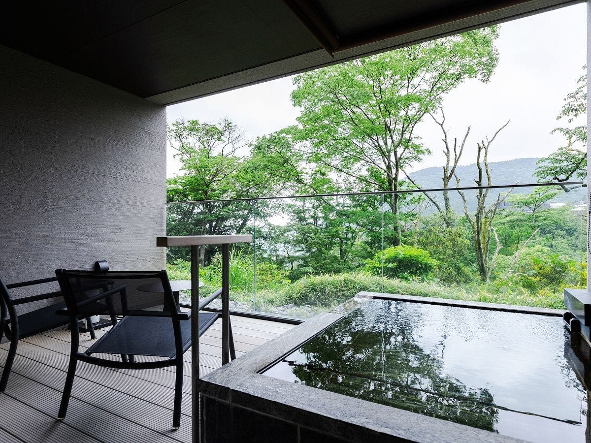 強羅の東西2棟に広がる全室温泉露天付きの客室。約56u前後のゆとりに、和・洋・最上階特別室まで多彩な選択肢。眺望テラスやラウンジと合わせ、客室で“自分のペース”の湯浴みを愉しめます |