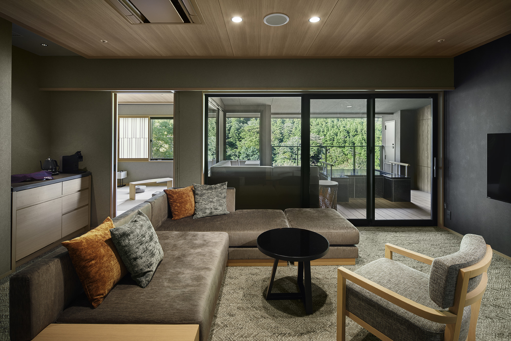 全客室に自家源泉の露天風呂を備え、箱根・須雲川のせせらぎと山の緑を望む和の佇まいと、モダンな寛ぎが融合した空間。テラス付きの露天風呂では、誰にも気兼ねすることなく、特別な湯時間をゆっくりとお愉しみいただけます |