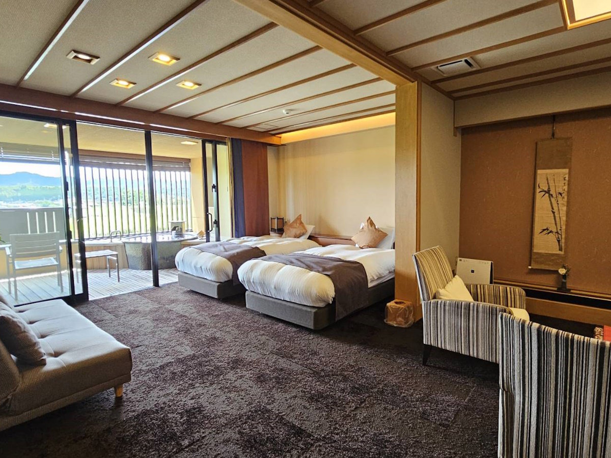 川沿いに佇む「水鏡庵」棟は、全室に天然温泉のプライベート露天風呂を備えた贅沢な空間。広々とした和洋室タイプに加え、段差を抑えたバリアフリー設計の客室も用意されており、菊池川のせせらぎを感じながら、落ち着いた雰囲気の中で温泉を心ゆくまで楽しめます。また、「鹿門亭」の和室は、伝統美あふれる設えが魅力で、和の趣を大切にした滞在を望む方におすすめです。 |