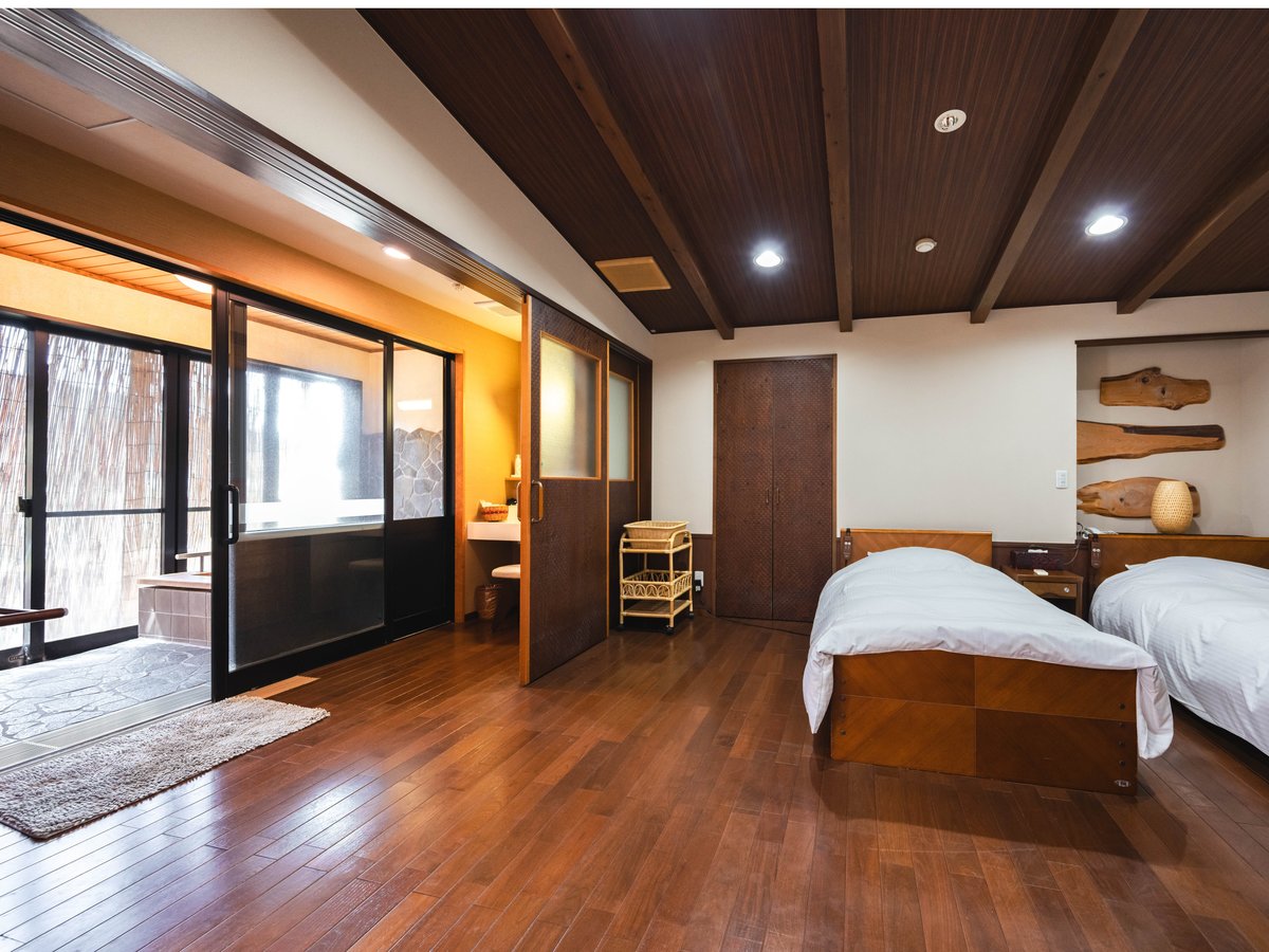 清流と里山の景観に囲まれた静かな宿。なかでも人気の和洋室「橙(だいだい)」は、ゆったりとした広さと段差のない設計で、車いすでの移動も安心です。室内から直接出入りできる半露天風呂を備えた客室もあり、周囲を気にせずプライベートな湯浴みを満喫できます。 |