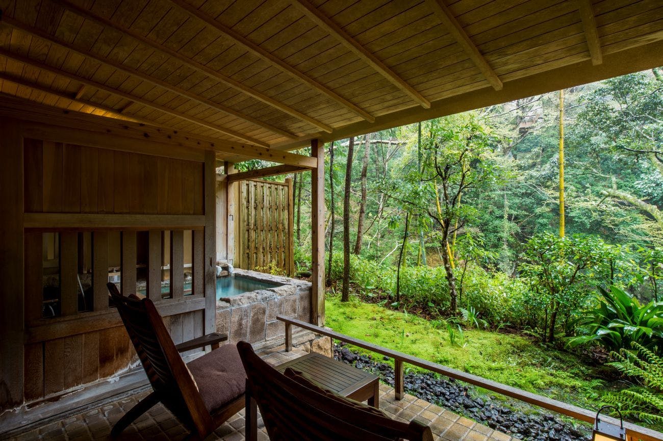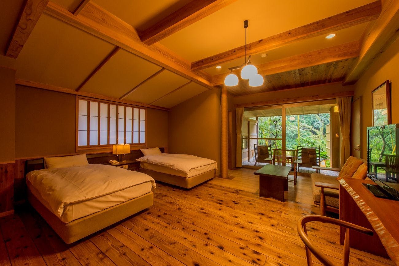 全18室すべてに専用露天風呂が備わり、谷川の木立や渓流の気配を間近に感じられる造り。客室タイプは純和室・和洋室・ベッド付き洋室など幅広く、テラス越しに広がる自然と木の温もりに包まれた、心地よい寛ぎの時間を味わえるのが魅力です。 |