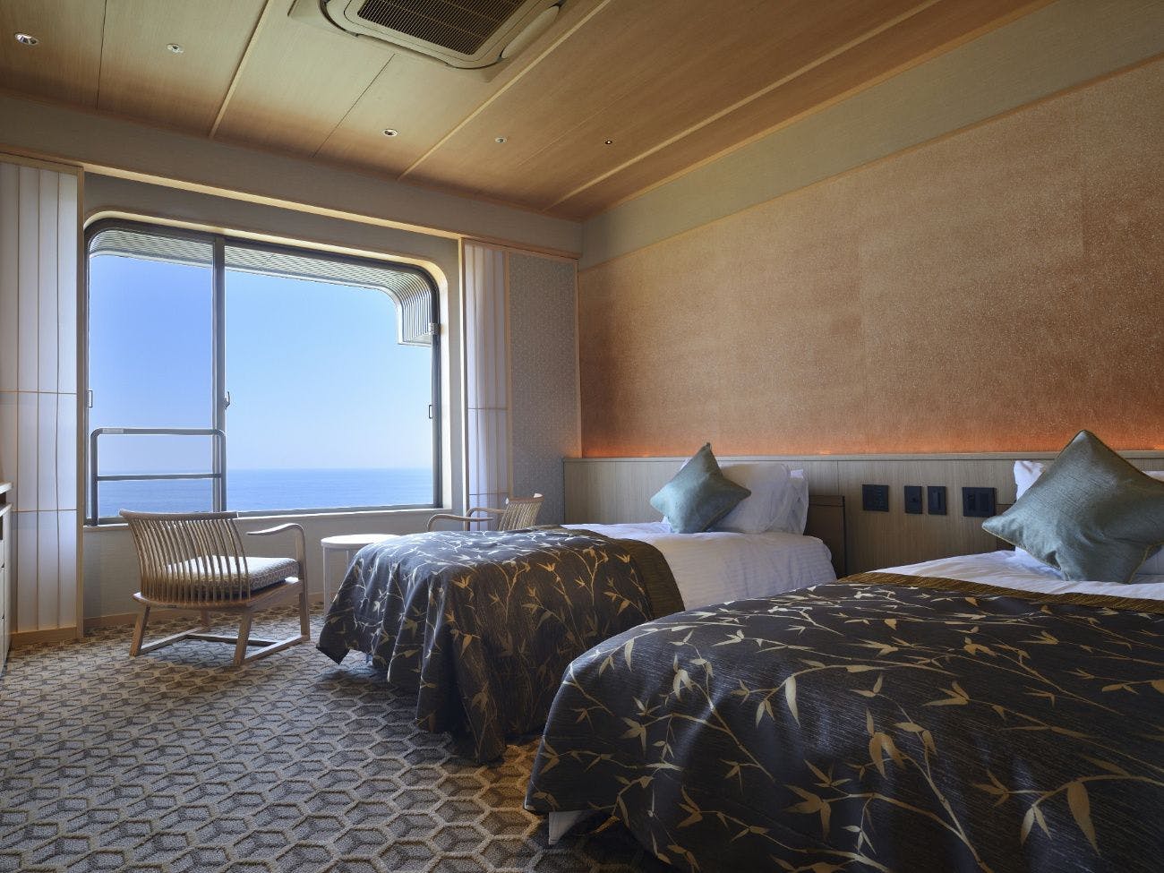 全室がオーシャンビューで、温泉露天風呂付き客室(各種スイート・プレミアム)、和室スーペリア、スーペリアツイン、そしてスーペリアユニバーサルツインといった多彩なタイプを備えています。 |